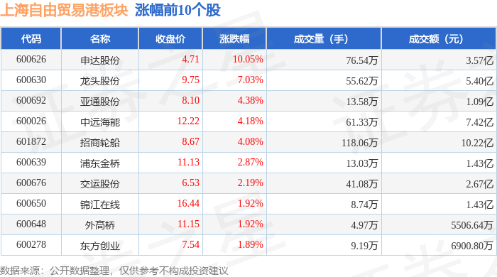 证券之星消息,10月10日上海自由贸易港板块较上一交易日上涨0.8%,申达股份领涨。当日上证指数报收于3897.03,下跌0.94%。深证成指报收于13355.42,下跌2.7%。上海自由贸易港板块个股涨跌见下表: