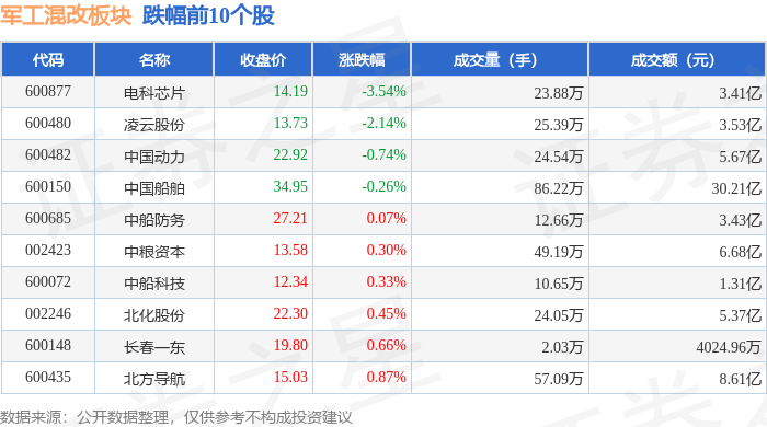 从资金流向上来看,当日军工混改板块主力资金净流入7.31亿元,游资资金净流入1.9亿元,散户资金净流出9.2亿元。军工混改板块个股资金流向见下表: