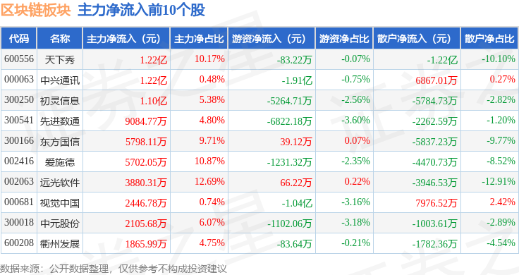 从资金流向上来看,当日区块链板块主力资金净流出100.36亿元,游资资金净流入30.31亿元,散户资金净流入70.05亿元。区块链板块个股资金流向见下表:
