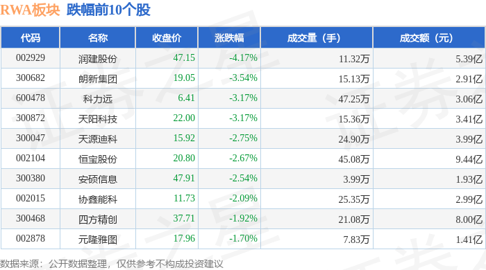 证券之星消息,10月10日RWA板块较上一交易日下跌2.26%,润建股份领跌。当日上证指数报收于3897.03,下跌0.94%。深证成指报收于13355.42,下跌2.7%。RWA板块个股涨跌见下表: