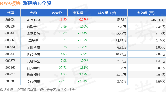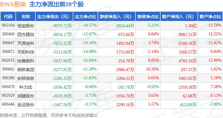 从资金流向上来看,当日RWA板块主力资金净流出5.24亿元,游资资金净流入7948.64万元,散户资金净流入4.45亿元。RWA板块个股资金流向见下表:
