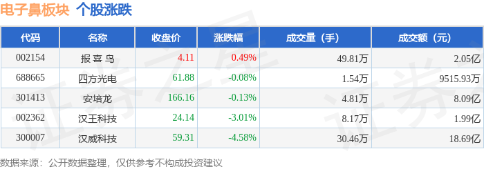 证券之星消息,10月10日电子鼻板块较上一交易日下跌2.2%,汉威科技领跌。当日上证指数报收于3897.03,下跌0.94%。深证成指报收于13355.42,下跌2.7%。电子鼻板块个股涨跌见下表: