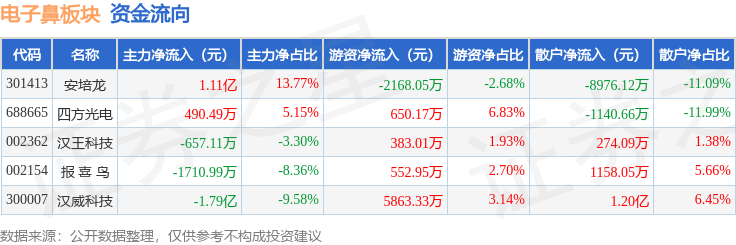 从资金流向上来看,当日电子鼻板块主力资金净流出8642.41万元,游资资金净流入5281.41万元,散户资金净流入3360.99万元。电子鼻板块个股资金流向见下表: