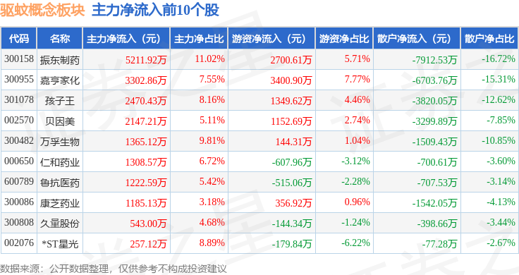 从资金流向上来看,当日驱蚊概念板块主力资金净流入1.74亿元,游资资金净流入4959.51万元,散户资金净流出2.24亿元。驱蚊概念板块个股资金流向见下表: