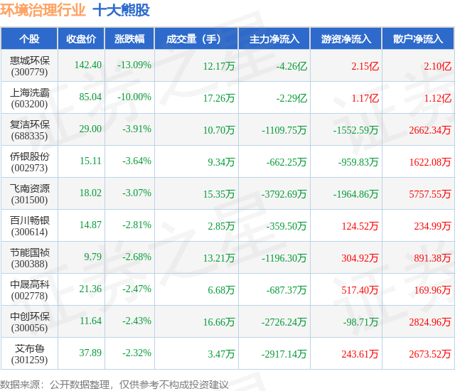 个股表现方面,环境治理行业当日领跌股为惠城环保(300779),该股当日报收142.4,下跌13.09%,成交量12.17万,主力资金净流出4.26亿元。上海洗霸(603200)以下跌10.0%紧随其后,该股当日成交量17.26万,主力资金净流出2.29亿元。除此之外,复洁环保(688335)、侨银股份(002973)、飞南资源(301500)均进入当日熊股之列。具体个股列表见下表: