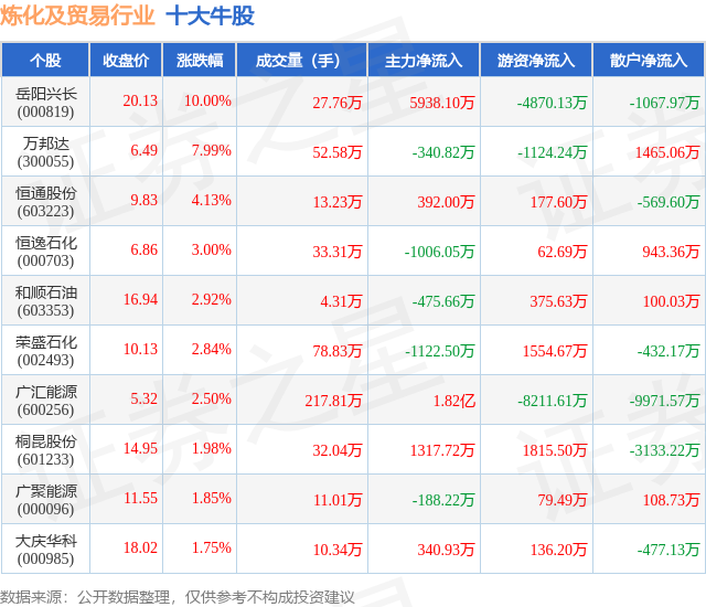 个股表现方面,炼化及贸易行业当日领涨股为岳阳兴长(000819),该股当日报收20.13,上涨10.0%,成交量27.76万,主力资金净流入5938.1万元。万邦达(300055)以上涨7.99%紧随其后,该股当日成交量52.58万,主力资金净流出340.82万元。除此之外,恒通股份(603223)、恒逸石化(000703)、和顺石油(603353)均进入当日牛股之列。具体个股列表见下表: