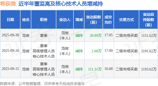 希荻微近半年内的董监高及核心技术人员增减持详情如下: