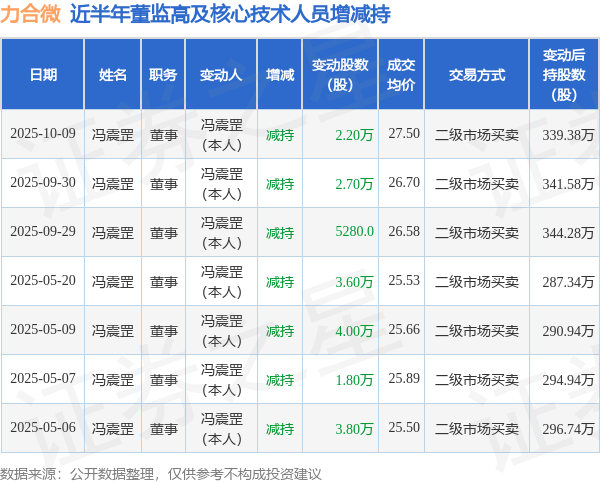 力合微近半年内的董监高及核心技术人员增减持详情如下:
