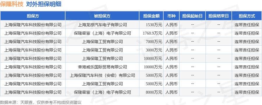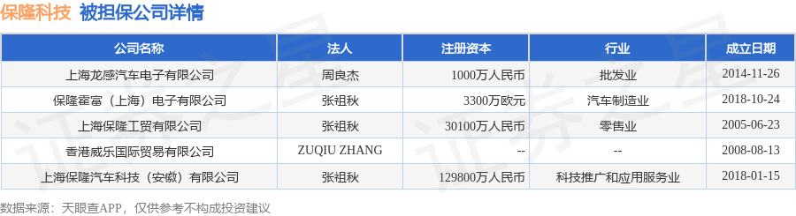 保隆科技10月9日披露9笔对外担保,被担保公司5家。对外担保明细如下表: