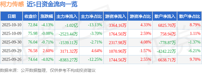 证券之星消息,截至2025年10月10日收盘,柯力传感(603662)报收于72.84元,下跌4.13%,换手率3.71%,成交量10.43万手,成交额7.76亿元。