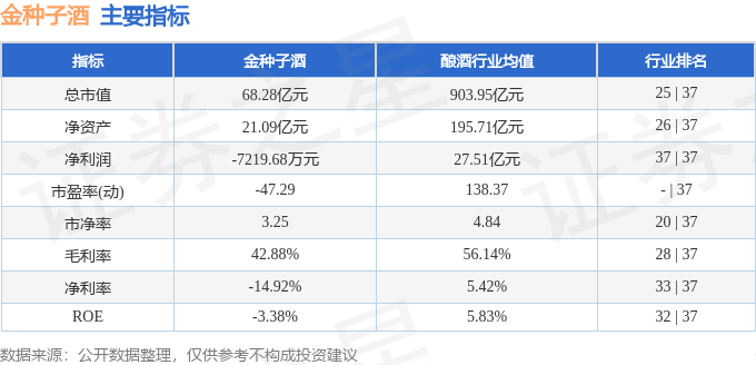 金种子酒(600199)主营业务:白酒和其他酒生产。普通货运(按许可证有效期限经营);包装材料加工、制造与销售;餐饮服务;生产酒类所需原辅材料收购;自营和代理各种商品和技术进出口业务。 金种子酒2025年中报显示,公司主营收入4.84亿元,同比下降27.47%;归母净利润-7219.68万元,同比下降750.54%;扣非净利润-7752.45万元,同比下降2226.38%;其中2025年第二季度,公司单季度主营收入1.88亿元,同比下降24.16%;单季度归母净利润-3326.91万元,同比下降408.17%;单季度扣非净利润-3694.08万元,同比下降229.98%;负债率31.63%,财务费用218.41万元,毛利率42.88%。