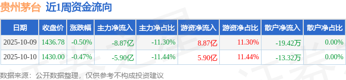 资金流向数据方面,本周贵州茅台主力资金合计净流出14.77亿元,游资资金合计净流入14.77亿元,散户资金合计净流出32.74万元。本周资金流向一览见下表: