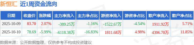 资金流向数据方面,本周新恒汇主力资金合计净流出6507.63万元,游资资金合计净流入289.01万元,散户资金合计净流入6218.62万元。本周资金流向一览见下表: