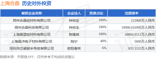 证券之星消息,根据天眼查APP显示,上海合晶(688584.SH)新增一起对外投资事件,被投资公司为深圳市芯威能半导体有限公司,法定代表人欧阳春林,投资占比为6%。该公司从事计算机、通信和其他电子设备制造业,注册资本为833.3333万人民币。目前,上海合晶共存在对外投资5项,详见下表: