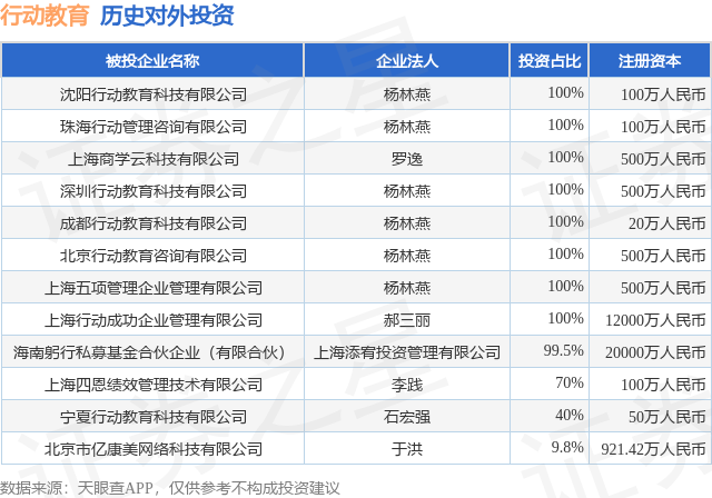证券之星消息,根据天眼查APP显示,行动教育(605098.SH)新增一起对外投资事件,被投资公司为沈阳行动教育科技有限公司,法定代表人杨林燕,投资占比为100%。该公司从事教育,注册资本为100万人民币。目前,行动教育共存在对外投资12项,详见下表: