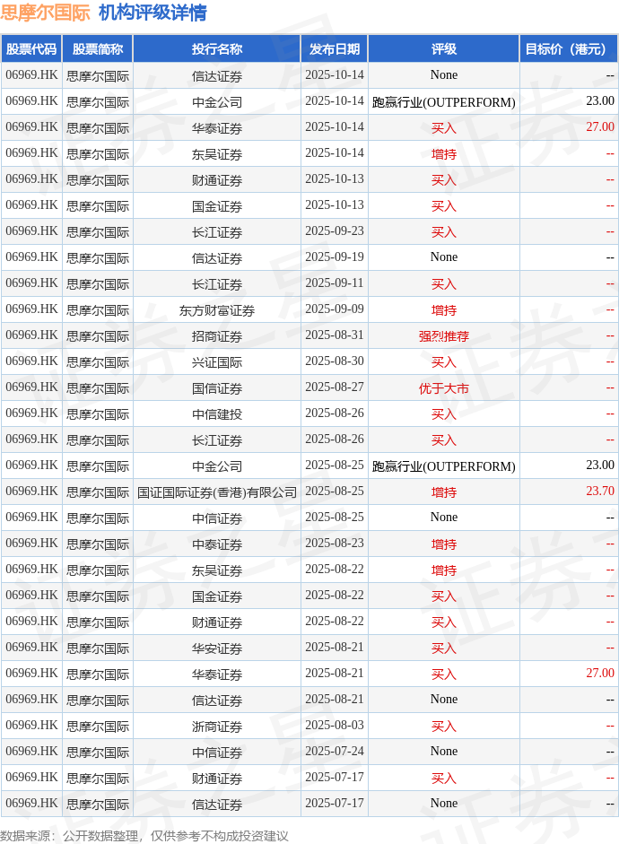 截至2025年10月15日收盘,思摩尔国际(06969.HK)报收于15.57港元,上涨2.84%,成交量3276.86万股,成交额5.07亿港元。投行对该股的评级以买入为主,近90天内共有14家投行给出买入评级,近90天的目标均价为24.74港元。信达证券最新一份研报给予思摩尔国际None评级。