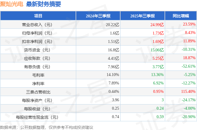 据证券之星公开数据整理,近期聚灿光电(300708)发布2025年三季报。截至本报告期末,公司营业总收入24.99亿元,同比上升23.59%,归母净利润1.73亿元,同比上升8.43%。按单季度数据看,第三季度营业总收入9.05亿元,同比上升31.5%,第三季度归母净利润5605.14万元,同比上升20.58%。本报告期聚灿光电公司应收账款体量较大,当期应收账款占最新年报归母净利润比达268.27%。