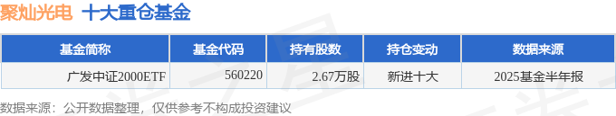 持有聚灿光电最多的基金为广发中证2000ETF,目前规模为0.54亿元,最新净值1.4529(10月15日),较上一交易日上涨1.64%,近一年上涨49.87%。该基金现任基金经理为夏浩洋。