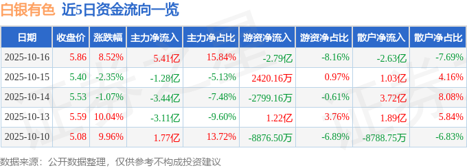 10月16日的资金流向数据方面,主力资金净流入5.41亿元,占总成交额15.84%,游资资金净流出2.79亿元,占总成交额8.16%,散户资金净流出2.63亿元,占总成交额7.69%。