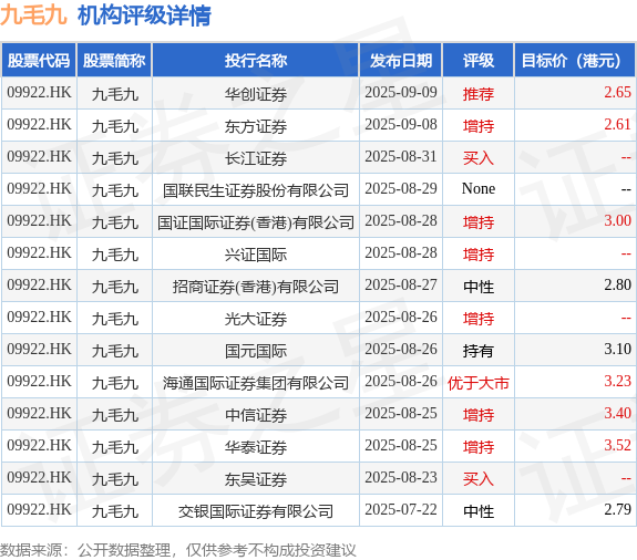 投行对该股的评级以增持为主,近90天内共有6家投行给出增持评级,近90天的目标均价为3.01港元。华创证券最新一份研报给予九毛九推荐评级,目标价2.65港元。
