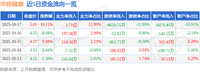 证券之星消息,华邦健康10月17日涨停收盘,收盘价5.01元。该股于9点30分涨停,4次打开涨停,截止收盘封单资金为1862.74万元,占其流通市值0.2%。