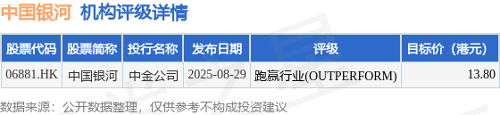 截至2025年10月20日收盘,中国银河(06881.HK)报收于11.23港元,下跌0.53%,成交量2661.5万股,成交额2.99亿港元。投行对该股的评级以跑赢行业(OUTPERFORM)为主,近90天内共有1家投行给出跑赢行业(OUTPERFORM)评级,近90天的目标均价为13.8港元。中金公司最新一份研报给予中国银河跑赢行业(OUTPERFORM)评级,目标价13.8港元。