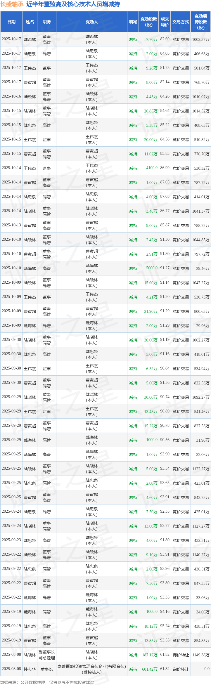 证券之星消息,根据10月20日市场公开信息、上市公司公告及交易所披露数据整理,长盛轴承(300718)最新董监高及相关人员股份变动情况:2025年10月17日公司董事,高管陆晓林、董事,高管曹寅超、监事王伟杰、高管陆忠泉共减持公司股份26.98万股,占公司总股本为0.0904%。变动期间公司股价下跌3.17%,10月17日当日收盘报81.52元。