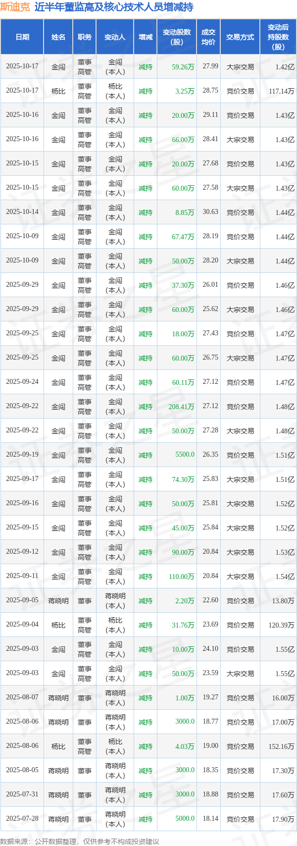 斯迪克近半年内的董监高及核心技术人员增减持详情如下: