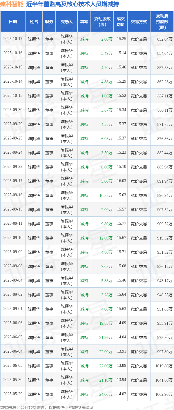 建科智能近半年内的董监高及核心技术人员增减持详情如下: