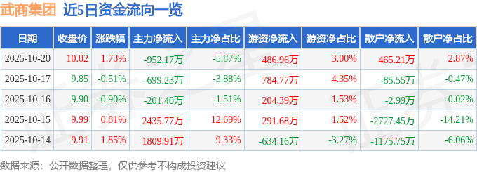 证券之星消息,截至2025年10月20日收盘,武商集团(000501)报收于10.02元,上涨1.73%,换手率2.11%,成交量16.22万手,成交额1.62亿元。