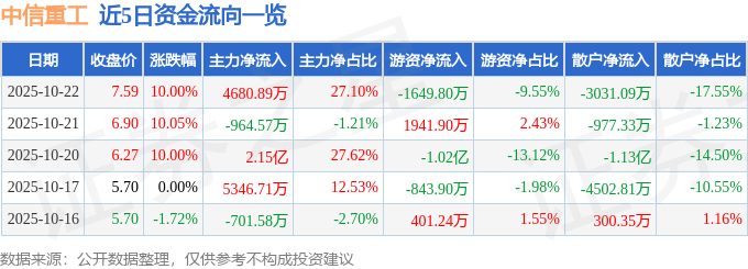 证券之星消息,中信重工10月22日涨停收盘,收盘价7.59元。该股于9点25分涨停,未打开涨停,截止收盘封单资金为3.13亿元,占其流通市值0.9%。