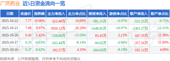 证券之星消息,广济药业10月22日涨停收盘,收盘价7.77元。该股于9点25分涨停,未打开涨停,截止收盘封单资金为6912.8万元,占其流通市值2.59%。