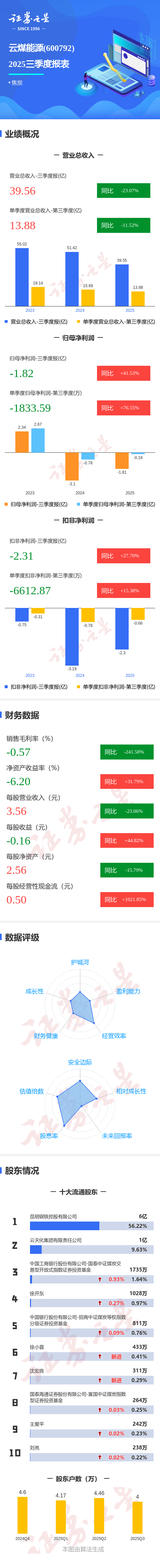证券之星消息,云煤能源2025年三季报显示,公司主营收入39.56亿元,同比下降23.07%;归母净利润-1.82亿元,同比上升41.54%;扣非净利润-2.31亿元,同比上升27.7%;其中2025年第三季度,公司单季度主营收入13.88亿元,同比下降11.53%;单季度归母净利润-1833.59万元,同比上升76.55%;单季度扣非净利润-6612.87万元,同比上升15.38%;负债率66.17%,投资收益382.61万元,财务费用6734.02万元,毛利率-0.57%。
