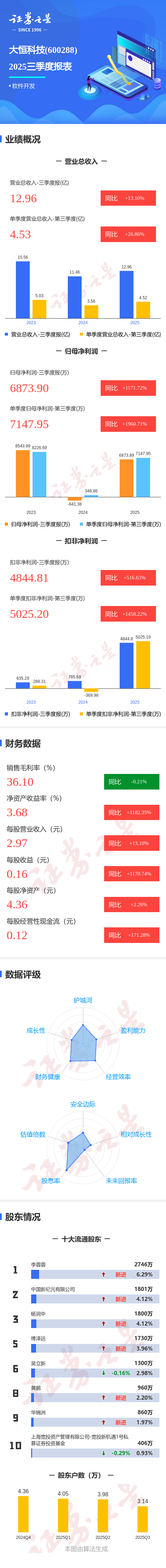 证券之星消息,大恒科技2025年三季报显示,公司主营收入12.96亿元,同比上升13.11%;归母净利润6873.9万元,同比上升1171.73%;扣非净利润4844.81万元,同比上升516.64%;其中2025年第三季度,公司单季度主营收入4.53亿元,同比上升26.86%;单季度归母净利润7147.95万元,同比上升1960.72%;单季度扣非净利润5025.2万元,同比上升1458.22%;负债率30.54%,投资收益3976.85万元,财务费用61.63万元,毛利率36.1%。