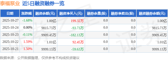 泰福泵业融资融券信息显示,融资方面,当日融资买入828.92万元,融资偿还629.6万元,融资净买入199.32万元。融券方面,融券卖出0.0股,融券偿还0.0股,融券余量0.0股,融券余额0.0万元。融资融券余额1.0亿元。