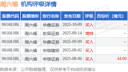投行对该股的评级以买入为主,近90天内共有4家投行给出买入评级,近90天的目标均价为44港元。华鑫证券最新一份研报给予周六福买入评级。