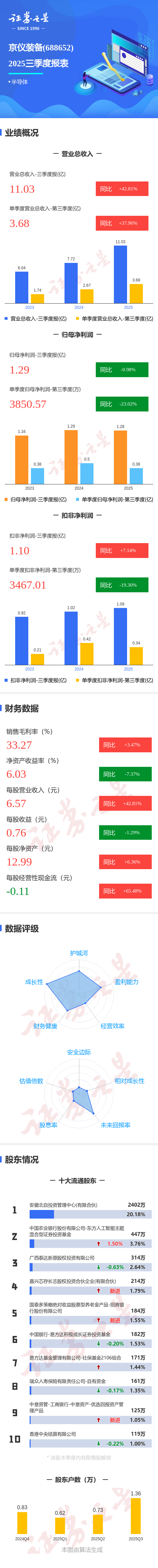 证券之星消息,京仪装备2025年三季报显示,前三季度公司主营收入11.03亿元,同比上升42.81%;归母净利润1.29亿元,同比下降0.99%;扣非净利润1.1亿元,同比上升7.15%;其中2025年第三季度,公司单季度主营收入3.68亿元,同比上升37.96%;单季度归母净利润3850.57万元,同比下降23.03%;单季度扣非净利润3467.01万元,同比下降19.3%;负债率51.63%,投资收益674.37万元,财务费用-81.63万元,毛利率33.27%。