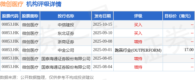投行对该股的评级以增持为主,近90天内共有3家投行给出增持评级,近90天的目标均价为17港元。中信建投最新一份研报给予微创医疗买入评级。
