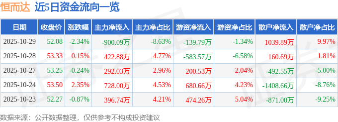 证券之星消息,截至2025年10月29日收盘,恒而达(300946)报收于52.08元,下跌2.34%,换手率2.62%,成交量1.99万手,成交额1.04亿元。