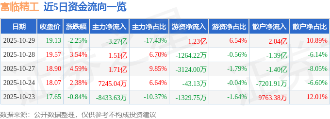 证券之星消息,截至2025年10月29日收盘,富临精工(300432)报收于19.13元,下跌2.25%,换手率5.85%,成交量98.83万手,成交额18.77亿元。