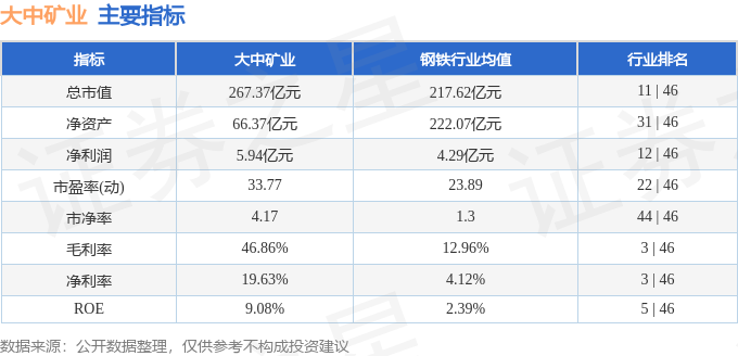 大中矿业主要指标及行业内排名如下: