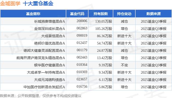 持有金域医学最多的基金为长城消费增值混合A,目前规模为5.16亿元,最新净值1.164(10月30日),较上一交易日下跌0.42%,近一年上涨16.58%。该基金现任基金经理为龙宇飞。