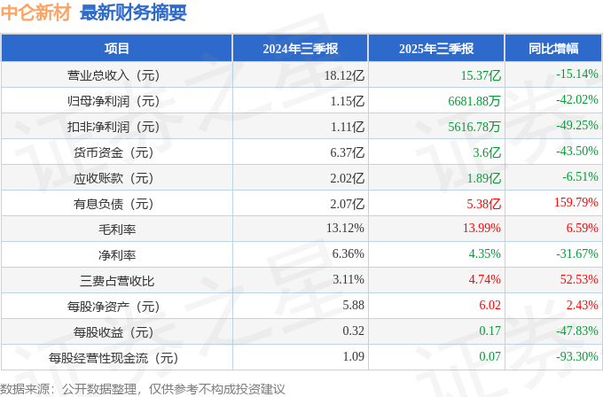 据证券之星公开数据整理,近期中仑新材(301565)发布2025年三季报。截至本报告期末,公司营业总收入15.37亿元,同比下降15.14%,归母净利润6681.88万元,同比下降42.02%。按单季度数据看,第三季度营业总收入5.3亿元,同比下降15.24%,第三季度归母净利润2518.63万元,同比上升66.96%。本报告期中仑新材公司应收账款体量较大,当期应收账款占最新年报归母净利润比达166.89%。