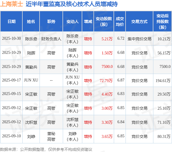 上海莱士近半年内的董监高及核心技术人员增减持详情如下: