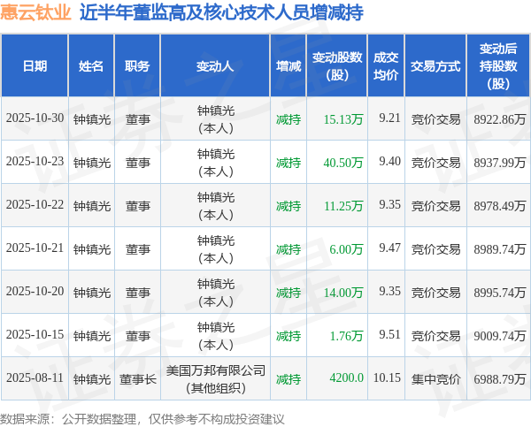 惠云钛业近半年内的董监高及核心技术人员增减持详情如下: