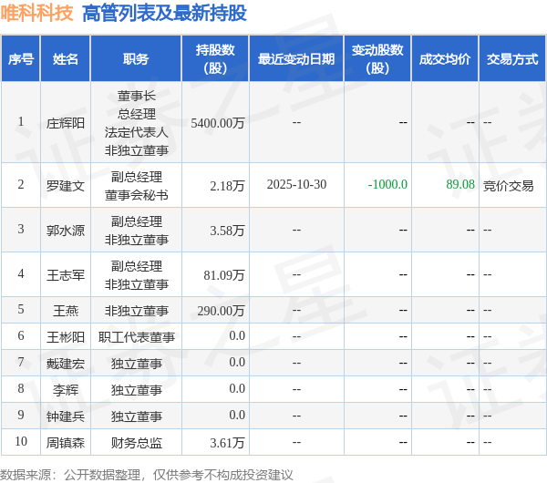 唯科科技近半年内的董监高及核心技术人员增减持详情如下: