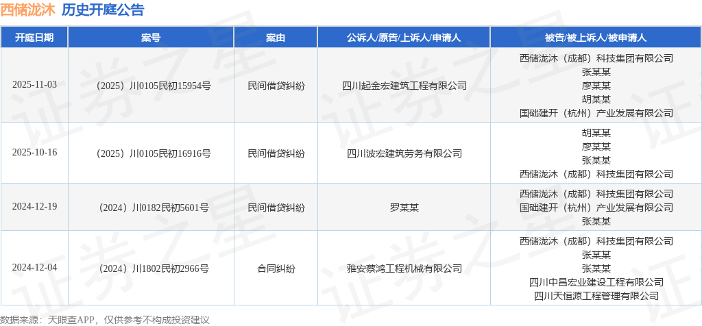 案号:(2025)川0105民初15954号根据统计,近一年内以西储泷沐(成都)科技集团有限公司为当事人的历史开庭公告有4则,其中案由为“民间借贷纠纷”的公告以3则居首,其次为“合同纠纷”有1则。历史开庭公告如下:
