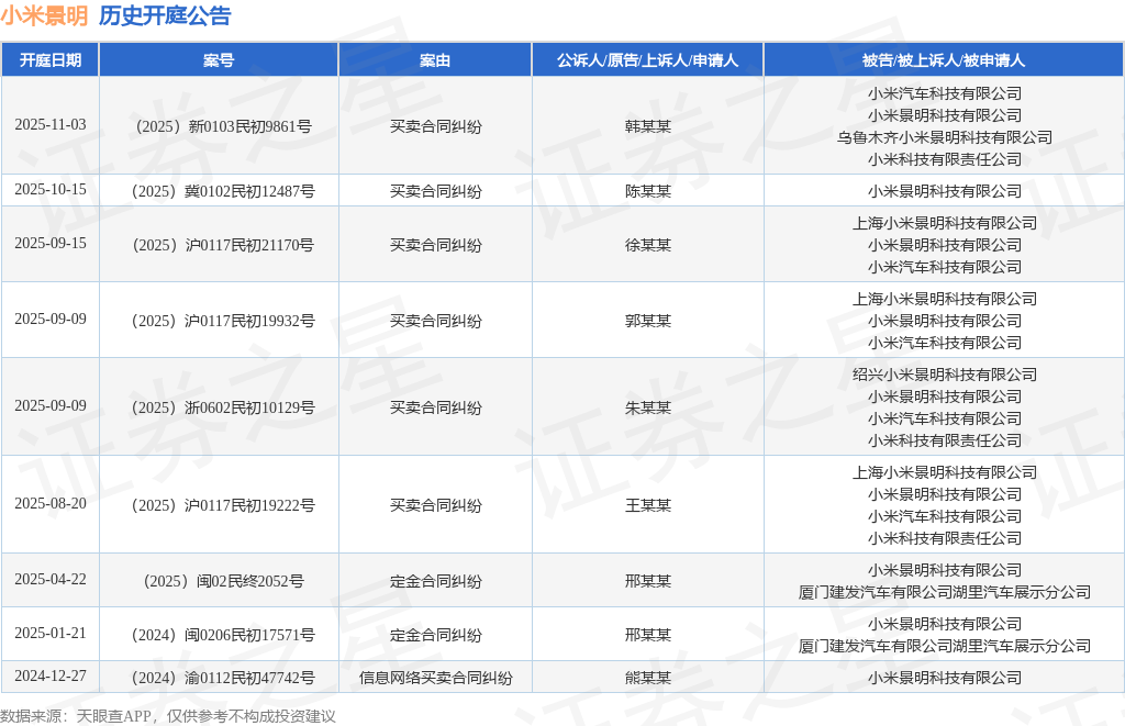 案号:(2025)新0103民初9861号根据统计,近一年内以小米景明科技有限公司为当事人的历史开庭公告有9则,其中案由为“买卖合同纠纷”的公告以6则居首,其次为“定金合同纠纷”有2则,“信息网络买卖合同纠纷”有1则。历史开庭公告如下: