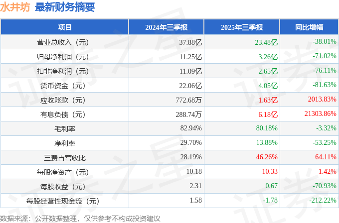据证券之星公开数据整理,近期水井坊(600779)发布2025年三季报。截至本报告期末,公司营业总收入23.48亿元,同比下降38.01%,归母净利润3.26亿元,同比下降71.02%。按单季度数据看,第三季度营业总收入8.5亿元,同比下降58.91%,第三季度归母净利润2.21亿元,同比下降75.01%。本报告期水井坊三费占比上升明显,财务费用、销售费用和管理费用总和占总营收同比增幅达64.11%。