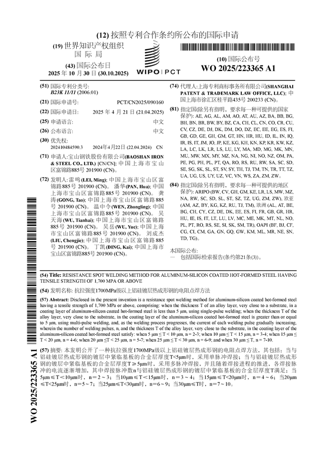 证券之星消息,根据企查查数据显示宝钢股份(600019)公布了一项国际专利申请,专利名为“抗拉强度1700MPa级以上铝硅镀层热成形钢的电阻点焊方法”,专利申请号为PCT/CN2025/090160,国际公布日为2025年10月30日。